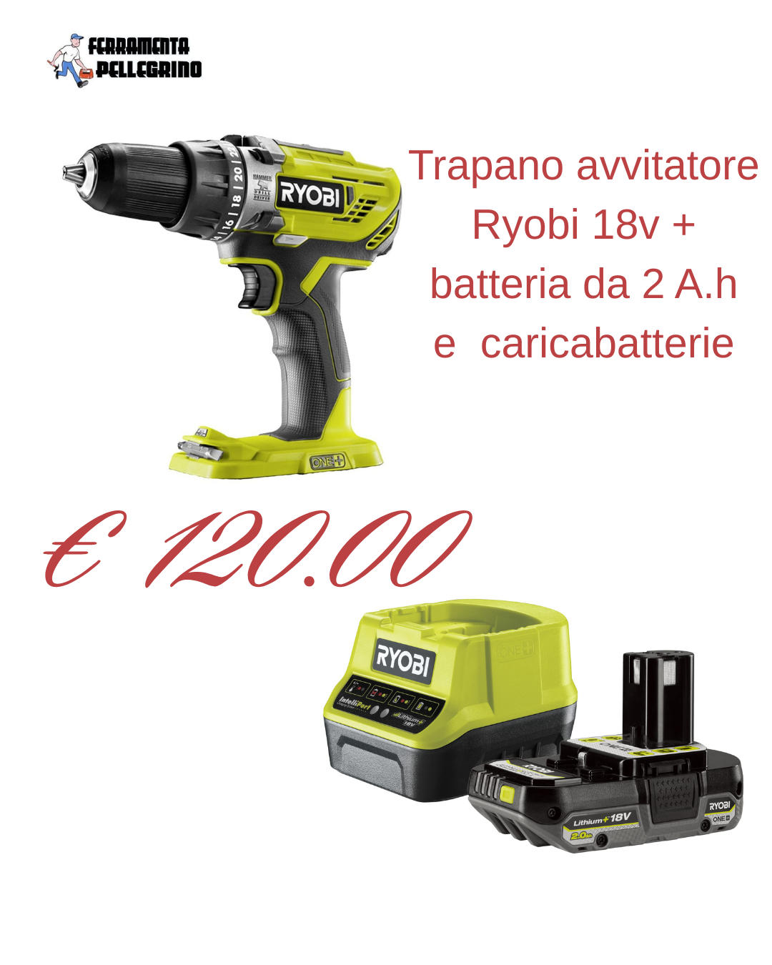 kit Ryobi composto da trapano avvitatore 18 v più carica batterie e batteria al litio da 2.0 Ah a soli €120.00!